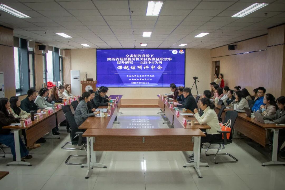 《全责征收背景下陕西省基层税务机关社保费征收效率提升研究——以汉中市为例》课题结项评审会接续召开,由雷晓康院长主持。本次评审专家团队由西北大学席恒教授、雷晓康院长和税务部门专家组成,省、市税务局相关领导及师生代表列席。