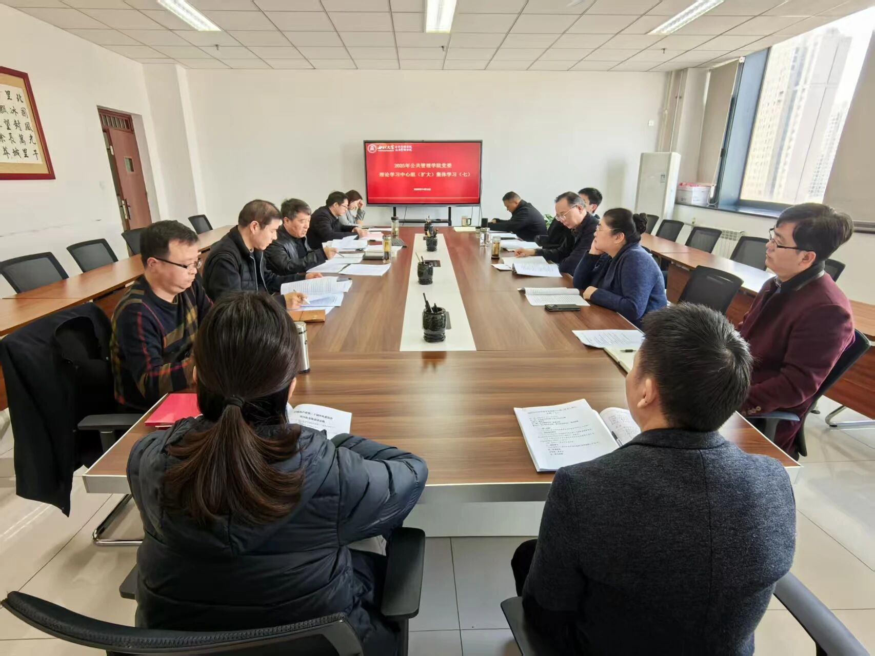 2025年11月12日下午,公共管理学院党委2025年理论学习中心组(扩大)第七次集体学习在学院中型会议室召开。学院党委书记窦争光主持会议,中心组全体成员、教工党支部书记、院长助理参会。