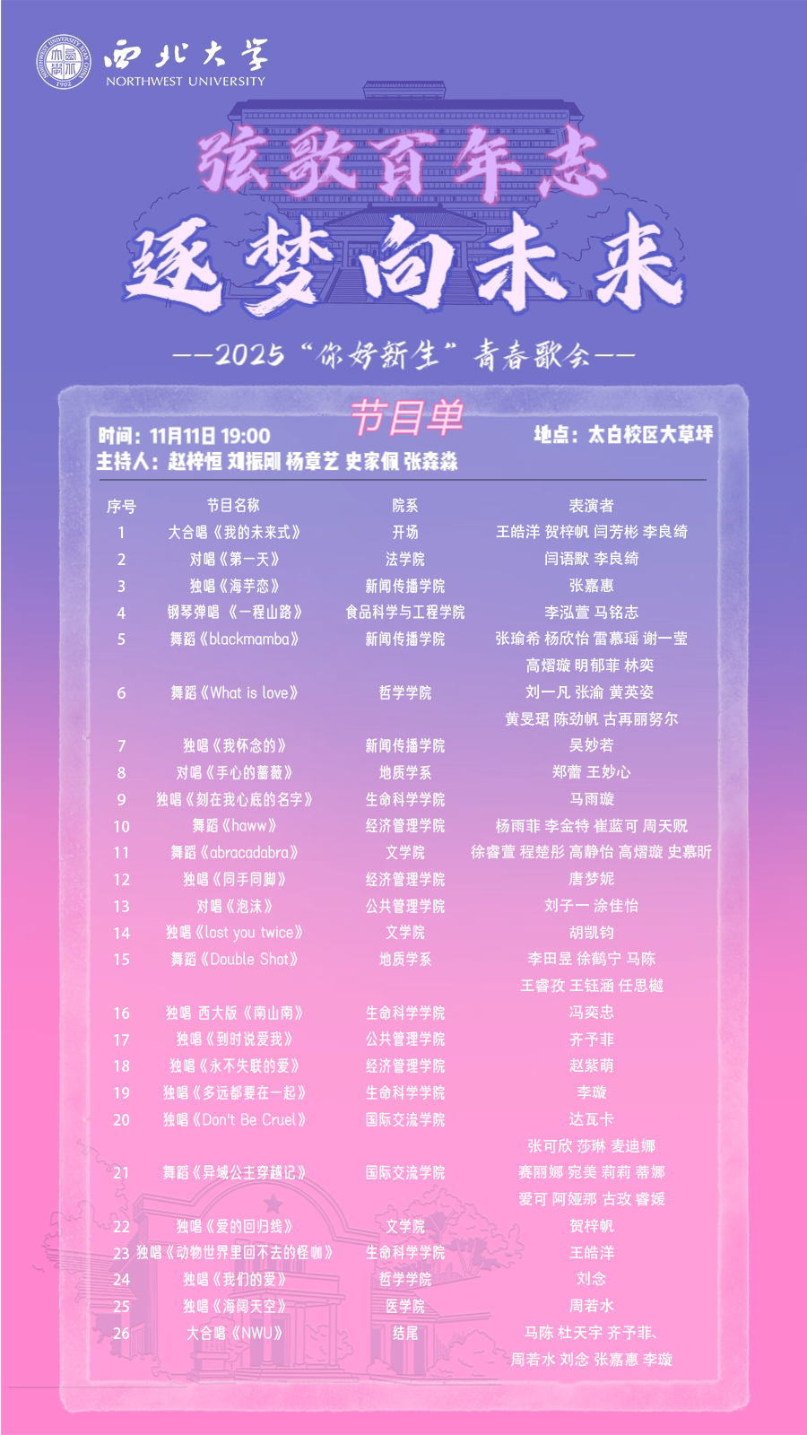 动摇曳。从《我的未来式》到《NWU》用属于西大的旋律,划开沉静的夜晚;从《blackmamba》到《Double Shot》用属于西大的动作,点燃沸腾的青春。点点荧光连成流动的星河,掌声与跟唱声在夏夜里回响。西大新生们,跟着同一段旋律轻轻晃动。没有拘束,只有真挚的喜欢与心灵的共振。这不只是一场演出,更是西大人共同凝住的时间,让年轻的温度,永远留在音乐的节拍里,留在西大的校园里!