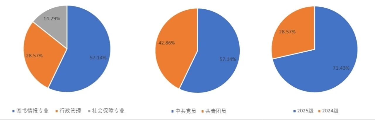 此次参与填写调查问卷的同学的基本信息,从专业分布来看(见图1),图书情报专业参与的同学最多,占到总人数的57.14%,行政管理专业的同学占到28.57%,社会保障专业的同学占14.29%。从政治面貌来看(见图2),中共党员的同学占到57.14%,共青团员的同学占到42.86%。从年级来看(见图3),2025级(研一)学生占比最高,达到71.43%,2024级(研二)占到28.57%。