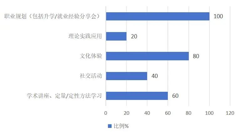 在希望参与的活动类型方面,职业规划(包括升学/就业经验分享会)占到100%;文化体验占比80%;学术讲座、定量/定性方法学习占比60%;社交活动占比40%;理论实践应用占比20%。这显示了研一同学们对于职业规划方面有着强烈的兴趣,希望通过活动的形式更加清晰明确自己未来的职业道路走向。文化体验位居第二,表明研一同学也希望通过参与文化活动来丰富自己的校园生活。学术讲座、定量/定性方法学习排名第三,表明研一同学在丰富文化生活的同时,也希望在科研学习上有一定突破。社交活动和理论实践应用也有所涉及,这些活动的参与有助于研一同学在新环境中建立社交网络和保持身心健康。