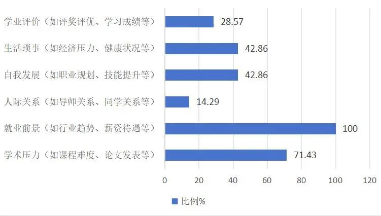 在调研中各位同学就自己在研究生阶段的焦虑源头进行分析,57.14%的同学经常感到焦虑,有100%的同学对于就业前景,如行业趋势、薪资问题较为焦虑;71.43%的同学则认为更让他们焦虑的是学术带来的压力,比如课程论文难、论文发表难等;还有42.86%的同学对自我发展,包括职业规划和技能提升等方面感到焦虑,其它会涉及到的焦虑因素还有如人际关系、生活琐事、就业评价等。大部分同学对自己未来的发展感到迷茫。建议可以通过多关注一些招聘会,多多了解用人单位的用人需求,对准需求去强化自己岗位竞争优势。