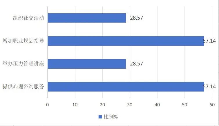 有焦虑就有调节,同学们就自己的焦虑调节方式进行了分享,85.71%的同学会选择听音乐、看电影等方式去缓解,有71.43%的同学选择自我调整,他们会阅读,看电影等让心先静下来,也有28.57%的同学面对焦虑会选择向家人、朋友倾诉。此外,还有同学会选择运动健身、寻求专业心理咨询、与老师沟通等方式。从同学们对学院的需求来看,57.14%的同学希望学院直接增加职业规划指导和心理咨询服务,有28.57%的同学认为学院可以组织多样化的社交活动,此外也可以举办压力管理讲座等。