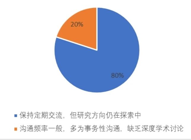 在与导师目前的沟通状态上,保持定期交流,但研究方向仍在探索中的同学占比达80%,沟通频率一般,多为事务性沟通,缺乏深度学术讨论的占比达20%。这说明目前研一学生普遍处于方向迷茫状态,更多是研究方法和研究方向的初步探索。此外,与导师的交流部分为事务处理,这也说明目前对于研一同学的要求更多是通过开始的自我初步探索为主。