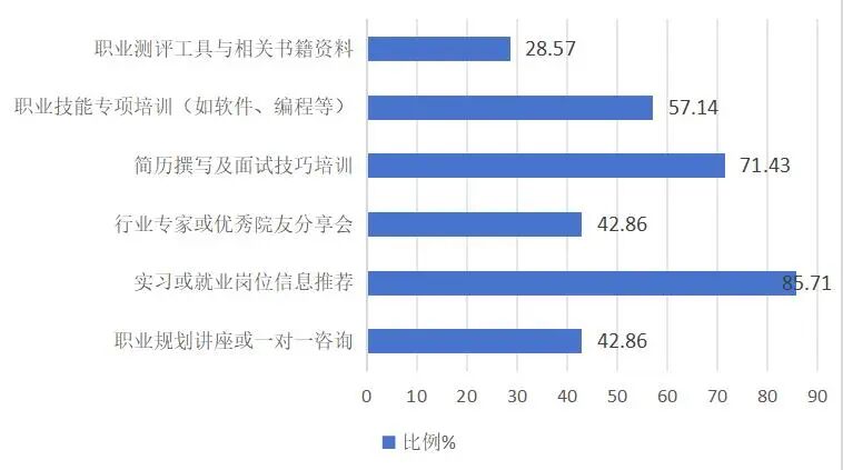 在认为影响职业规划的因素中,71.43%的认为职业兴趣和薪资待遇与职业发展空间以及专业背景是关键因素,57.14%认为个性特质很重要,42.86%认为技能专长很重要,28.57%认为行业前景与市场需求以及家庭期望或建议也是不可忽视的因素。此外,在同学们希望学院在就业方面提供的帮助上,有85.71%的希望得到实习或就业岗位信息的推荐,有71.43%的同学希望提供简历撰写及面试技巧培训,有57.14%希望提供职业技能专项培训(如软件、编程等),有42.86%的希望举办行业专家分享会及职业规划讲座等,28.57%的希望学院提供职业规划相关书籍或资料。这说明同学们在职业规划上有很强的就业意愿,绝大多数同学都希望能够有实习或就业的机会。