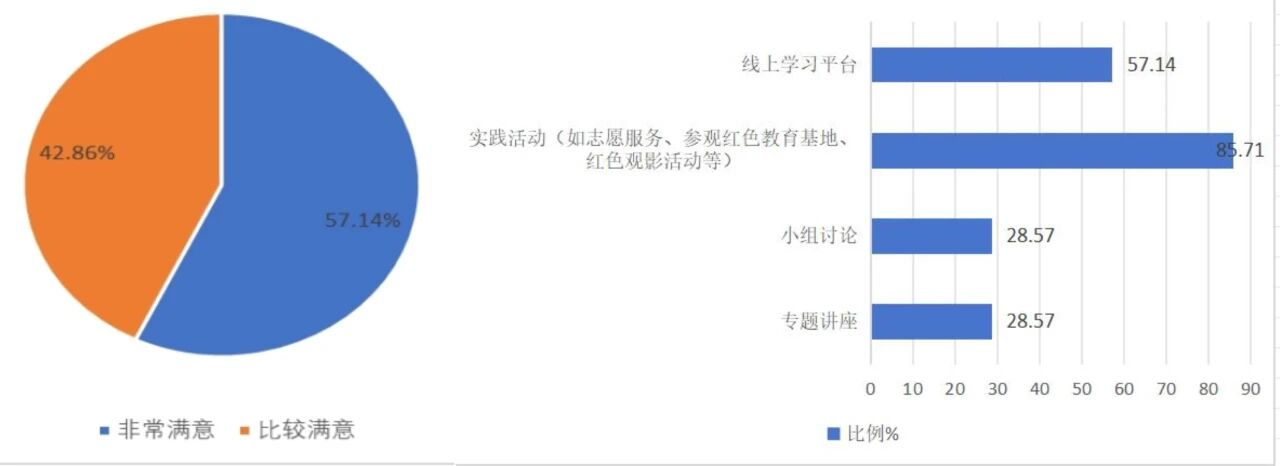 我院不断加强研究生的思想引领工作,研究生对于学院的思想引领工作也持积极态度。有57.14%的人对学院思想引领工作表示非常满意,42.86%的同学比较满意。他们中绝大部分的同学都对参加思想政治活动极其感兴趣,占比达85.17%,对于思想活动的具体开展形式,同学们也积极投出了自己心仪的一票。85.71%的同学喜欢参加实践活动,如志愿服务、参观红色教育基地、红色观影活动等,57.14%%的同学则认为线上平台学习更佳,也有28.57%的同学支持开展专题讲座和小组讨论。对于参与思想政治活动的原因,85.71%是想主动学习,提升思想觉悟,57.14%是计入学分或综测,42.85%是活动形式或内容吸引或组织要求。对于思想活动特点,85.71%认为形式创新,互动性强,71.43%认为内容新颖,紧跟时事。此外,有权威专家或榜样人物分享等也有涉及。