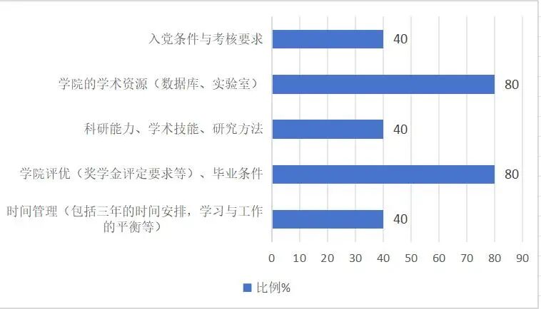 对研一同学在研究生阶段学术科研与生活方面存在的困惑调研显示,学院评优(奖学金评定要求等)、毕业条件占比达80%;学院的学术资源(数据库、实验室)占比同样占比达80%;科研能力、学术技能、研究方法和时间管理(包括三年的时间安排,学习与工作的平衡等)及入党条件与考核要求占到40%的同样比例。这些结果表明目前研一同学在科研上存在制度考核的困惑与焦虑,如对毕业条件的构成结构尚不清楚等问题;学术资源上存在基础条件的需求,包括数据库、实验室资源等;科研能力、研究方法和时间管理上存在适应性不足等问题,这可能部分源于本科与研究生阶段的学术要求断层。