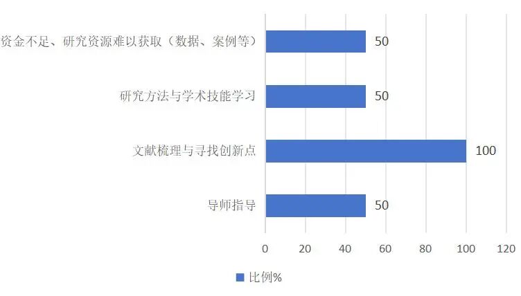 在对研二同学的调研中,在学术研究或项目经历遇到的挑战上,文献梳理与寻找创新点居于高位,占比达到100%;研究方法与学术技能学习和资金不足、研究资源难以获取(数据、案例等)以及导师指导占比均为50%;研二进入研究生生涯的中间阶段,研究方向的确定成为研二同学的重要事项,因此在面临文献梳理与创新点寻找上成为目前遇到的最大挑战。此外,研二阶段经历研一的初步自我探索,更多同学进入到自己研究领域的深耕,很多的研究方法包括数据、案例等资源需要付费获得,这也成为制约研二同学学术研究的困难成因之一。此外,研二同学认为导师的指导在研究生学术成长中起着至关重要的作用,但目前和导师之间的沟通还存在不足。大家期望在这方面学院可以多加指导与帮助。