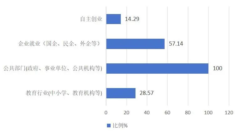 在职业目标的选择上,100%的同学集中在公共部门,57.14%的同学倾向于企业就业(国企、民企、外企等),28.57%的同学集中在教育行业,14.29%的同学选择自主创业。这说明同学们在选择职业目标时大多以专业确定自己的发展去向,未来多数同学可能会通过考公考编实现自己的职业目标。
