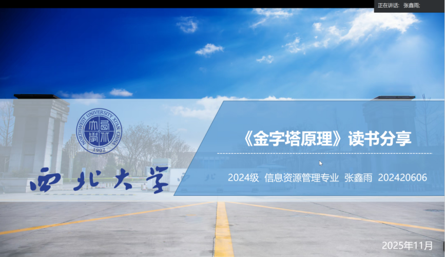 2025年11月27日,我院线上举办了2025年第9期正学读书会。西北大学公共管理学院2024级行政管理专业硕士研究生樊伟杰、2025级社会保障专业硕士研究生郎英华、2025级行政管理专业硕士研究生李灵恩、2025级公共政策专业硕士研究生侯志鹏、2024级信息资源管理专业硕士研究生张鑫雨、2024级社会保障专业硕士研究生黄璐潞、2025级应急管理专业硕士研究生耿亚杰分别作为主讲人进行读书汇报,公共管理学院2025级博士研究生施定涛担任评议人,部分研究生旁听了此次报告会。