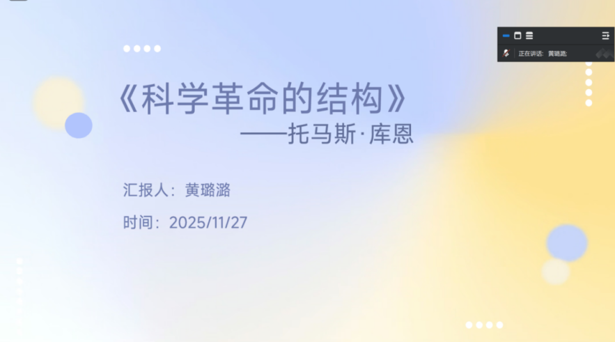 施定涛博士对此次分享进行了点评。他首先肯定了黄璐潞的分享结构清晰、逻辑严谨,不仅系统梳理了《科学革命的结构》的核心理论框架,更通过生活化类比与科研场景结合,让抽象的科学哲学概念落地,帮助听众准确把握 “范式转换”“不可通约性” 等关键理论的内涵。施定涛博士强调,此次分享不仅传递了经典著作的思想价值,更培养了同学们的学术反思能力,鼓励大家在今后的研究中以更辩证的视角看待理论局限与创新可能。
