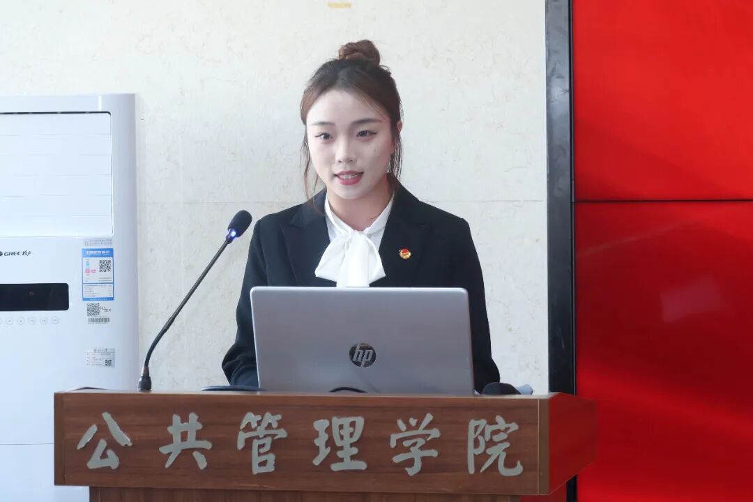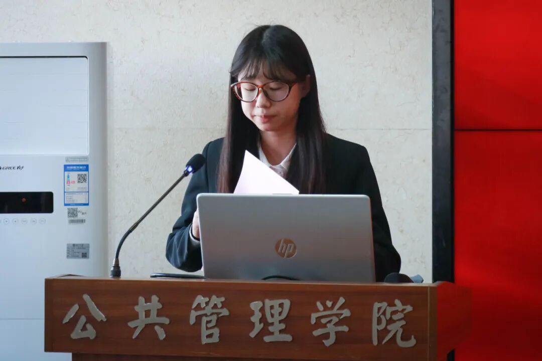 会议第三项,西北大学学生会主席团成员李富蓉致辞。李富蓉同学肯定了公共管理学院学生会、研究生会在思想引领、学术创新、权益服务等方面的优异成绩,赞扬了公管学子的担当与作风。同时并对未来公共管理学院学生工作提出了新的展望和期待,希望公共管理学院(应急管理学院)学生会、研究生会在学院领导、老师的关怀指导下,在同学的理解和支持下,在学生会全体工作人员的共同努力下,持续筑牢思想根基,弘扬务实作风,团结带领广大青年学子将专业知识与国家发展相结合,为学院发展、学校“双一流”建设及民族复兴注入青春动能。