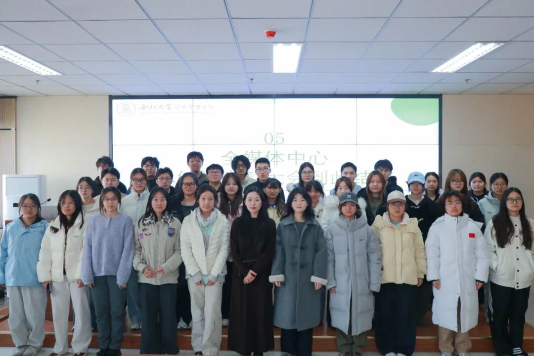 2025年12月17日,公共管理学院全媒体中心总结表彰大会于西学楼13层多媒体会议室顺利举行,全媒体中心指导老师杨琬钰与全媒体中心全体成员参加了本次会议,会议由秘培组副组长王佳乐主持。