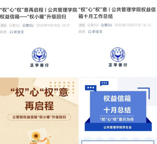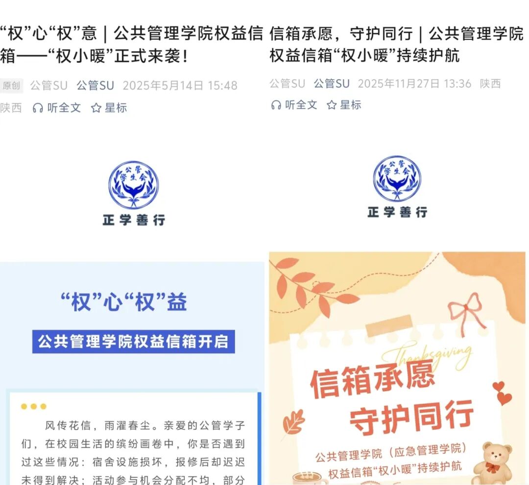学院建立“权小暖”权益信箱,畅通学生诉求反馈渠道,定期发布工作总结,对学生提出的权益问题及时回应、妥善处理,构建起“收集-反馈-处理-总结”的闭环服务体系,为学风培育注入暖心动能。“权小暖”权益信箱在学院微信公众号开设专属入口,方便学生随时反馈学习环境优化、教学资源保障、生活服务改进等与学业相关的权益诉求。针对学生反映的宿舍水槽声响扰同学、浴室花洒常停水、校内车堵影响出行、乐跑软件记录不准等问题,第一时间联动教务、后勤等部门妥善解决,确保学生诉求“事事有回应、件件有着落”。