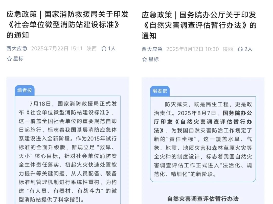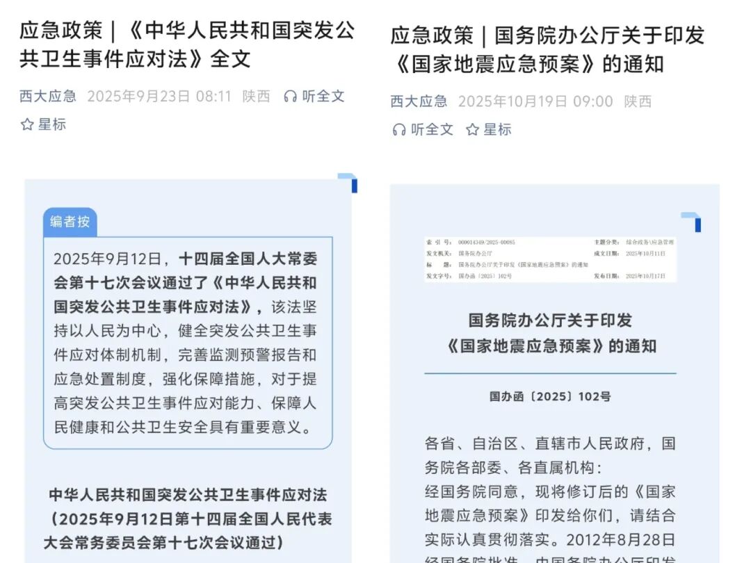 强化应急管理领域制度建设与法治教育,学院“西大应急”公众号2025年系统宣介应急管理领域系列政策法规。通过官方公众号转发并解读《中华人民共和国突发公共卫生事件应对法》《国家地震应急预案》《应急管理先进适用技术装备推广与安全生产落后技术装备淘汰目录管理办法(试行)》等3篇国家级政策文件,使师生及时了解应急管理领域的最新制度安排,深刻认识突发公共卫生事件应对、地震灾害防范、安全生产监管等方面的规范化管理要求。学院将政策学习与专业教学、社会实践紧密结合,引导学生树立法治意识、规则意识,提升依法治理、科学应对突发事件的专业素养,为培养新时代应急管理人才筑牢基础。