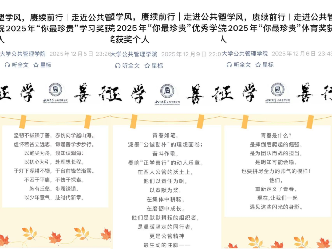为凝聚榜样力量、彰显公管风采,学院以多维宣传矩阵放大典型示范效应。学院举办“你最珍贵”优秀学生表彰大会,此次表彰对2025年在学习、体育、文艺等不同领域中表现突出、勇创佳绩,且为学院赢得荣誉的优秀个人与先进集体。大会现场颁发了学习奖、体育奖、文艺奖、进步奖、公益奖、优秀学生干部奖、优秀集体奖共计七项荣誉奖项。表彰活动后,学院通过官方微信公众号推出系列宣传内容,累计发布7篇专题推送,深度报道获奖公管学子及集体的先进事迹,全方位展示其风采。此举旨在引导公管专业学子回顾过往、汲取成长经验,同时立足当下、务实开拓未来,以获奖榜样为标杆,不断向优秀看齐、向先进靠拢。