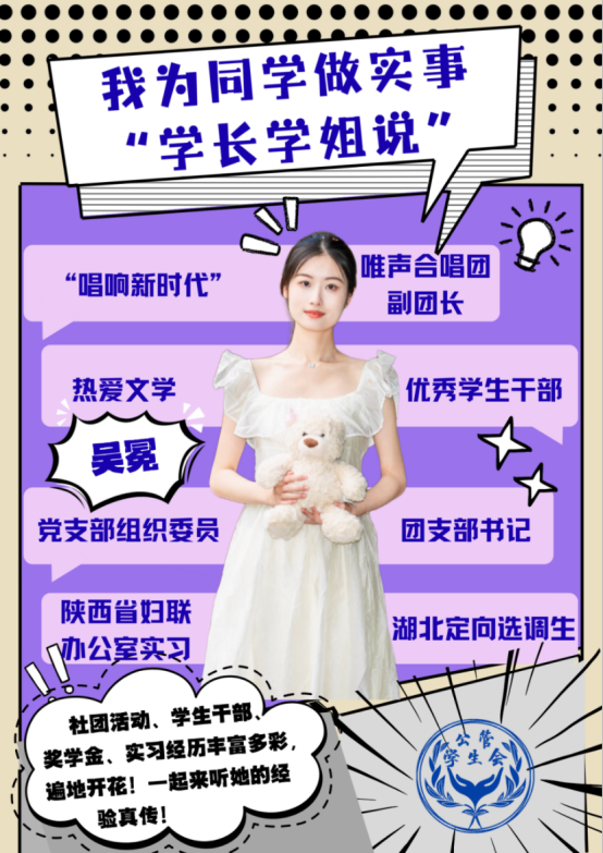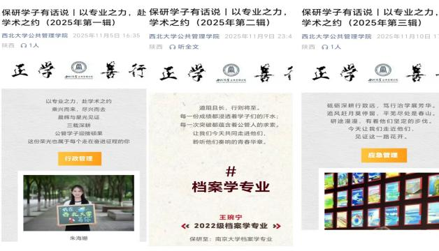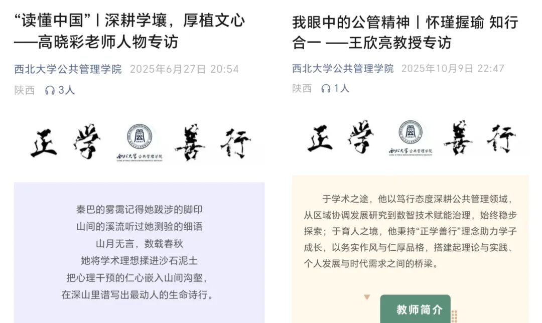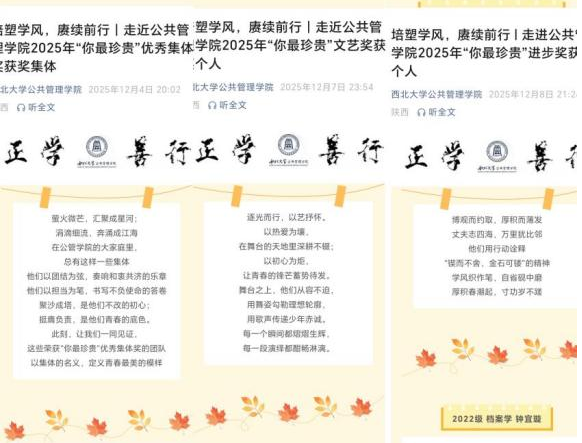 学院持续做好“我眼中的公管精神”系列专栏,对公管院教师群体进行深度访谈,传递学院“怀瑾握瑜,知行合一”的精神内核,体现当代高校教师的责任担当。同时拍摄制作《深耕学壤,厚植文心:高晓彩老师人物专访》,深度宣传“五老精神”,弘扬其扎根教育扶贫事业的忠诚坚守与深耕民生服务研究的奉献担当。并在2025年陕西省教育系统关工委“读懂中国”活动中荣获优秀征文奖、优秀微视频奖。系列视频的生动诠释让“公管精神”在学子心中扎根,代代传承。