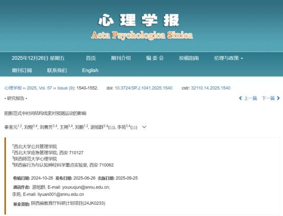 论文信息:秦奎元,刘煜,刘赛芳,王朔,刘鹏,游旭群,李苑. (2025). 阻断范式中时间结构线索对预测运动的影响.心理学报, 57(09),1540-1552.