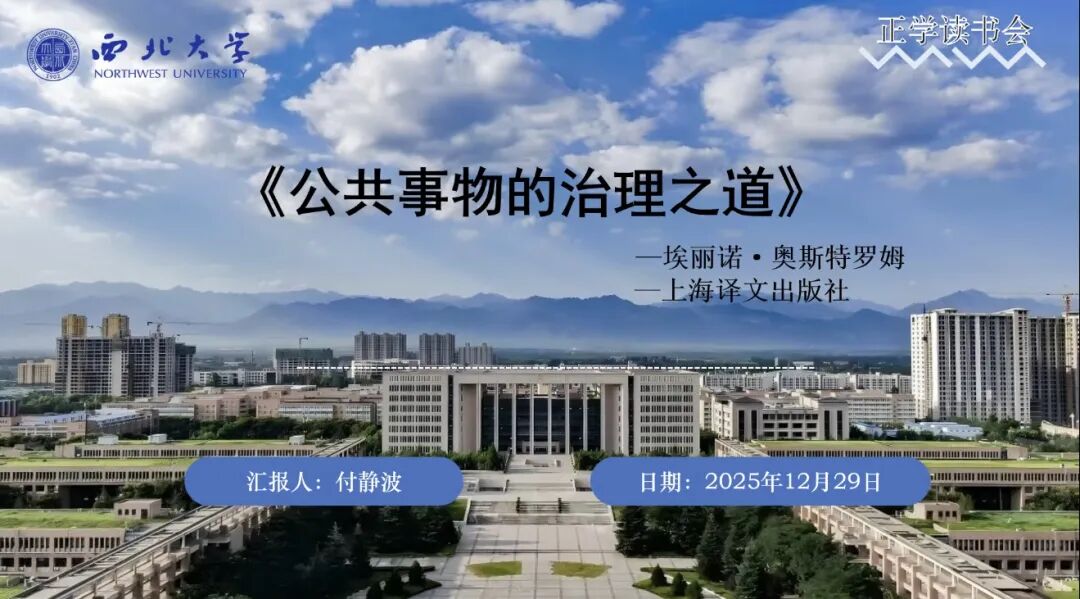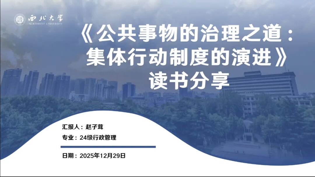 2024级行政管理专业硕士研究生赵子茸分享的书籍是2009年诺贝尔经济学奖得主埃莉诺・奥斯特罗姆的经典著作《公共事物的治理之道:集体行动制度的演进》,该书被誉为“20世纪美国政治学界引用率最高的当代经典”,对公共池塘资源和公共财产制度的研究具有重要现实意义。分享围绕作者简介、内容概要、本书贡献与实践启示四大板块展开,系统梳理了公共事务治理的核心逻辑。本书首先反思了公地悲剧、囚犯困境博弈等经典模型,批判了“政府管制—私有化”二元治理模式的局限,进而深入挖掘自主治理理论的内涵。通过对瑞士阿尔卑斯山牧场、菲律宾桑赫拉灌溉系统等成功案例与土耳其渔业管制失灵等反面案例的对比,具象化呈现了自主治理八项设计原则的实践价值,赵子茸同学结合我国社区治理、跨区域生态治理等现实场景,探讨了自主治理的应用空间、实践效果及局限突破路径,搭建起理论与实践的沟通桥梁。