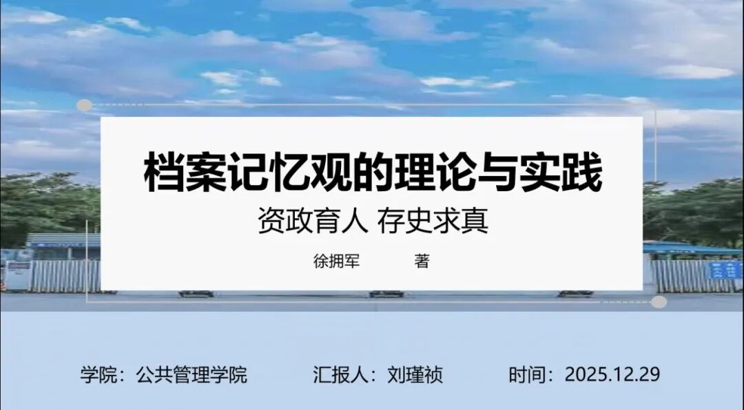 2023级档案学专业硕士研究生刘瑾祯分享的书籍是徐拥军教授的《档案记忆观的理论与实践》,她从作者简介、著作背景、内容分析以及个人感悟四个方面,系统阐述了该书的核心观点与理论价值。她首先梳理了档案记忆观的发展脉络和研究现状,结合国内外“记忆工程”的生动实践,如联合国教科文组织“世界记忆工程”、中国“城市记忆”“乡村记忆”等项目,清晰展示了档案在建构社会记忆、凝聚民族认同、传承文化遗产中的关键作用。书中对建设“中国记忆”数字资源库的构想,引发了同学们对档案数字化、记忆资源整合与利用的进一步思考。在个人总结及感悟内容中,她认为通过阅读本书让人深刻认识到档案不仅是静态的历史记录,更是动态的社会记忆建构者。档案工作已超越传统保管职能,转向积极参与记忆塑造、文化传承与社会对话。这要求当代档案工作者具备更强的历史意识与社会责任感,通过创新手段让档案“活”起来,真正实现“存史、资政、育人”的使命。