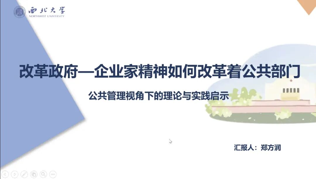 2025级行政管理专业硕士研究生郑方润围绕《改革政府:企业家精神如何改革着公共部门》一书展开分享。该书由戴维·奥斯本与特德·盖布勒合著,提出“企业家政府理论”,主张将企业效率与创新精神引入公共部门,推动政府向结果导向、分权协作转型,成为新公共管理运动的重要理论基石。她指出,该理论诞生于西方财政压力、全球化竞争与信息技术发展的多重背景下,旨在应对传统官僚制效率低下、回应迟缓等问题。书中提炼的十大原则推动政府角色从“直接提供者”转向“引导者”,治理模式更注重竞争、结果与公众需求。实践方面,美国克林顿时期的“重塑政府”计划与我国浙江省“最多跑一次”改革,均体现该理念的本土化应用。同时也提醒我们,市场化逻辑与公共服务公平性之间需取得平衡,改革应结合本国制度环境审慎推进。最后,郑方润同学指出企业家政府理论对中国改革的启示在于追求更高效、灵活、透明的治理模式,推动政府服务优化与责任强化。