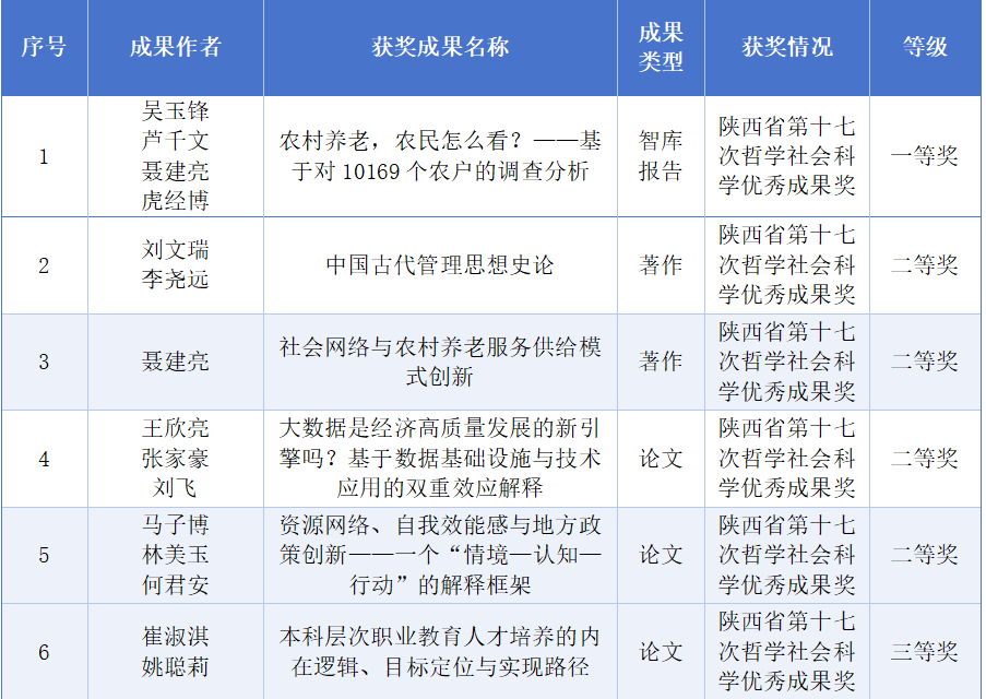 近日,陕西省人民政府正式印发《关于表彰第十七次哲学社会科学优秀成果的通报》,正式公布本届哲学社会科学优秀成果奖获奖名单。我院师生凝心聚力、深耕研究,在此次评选中表现突出、喜获佳绩,共斩获6项奖励,其中一等奖1项、二等奖4项、三等奖1项。