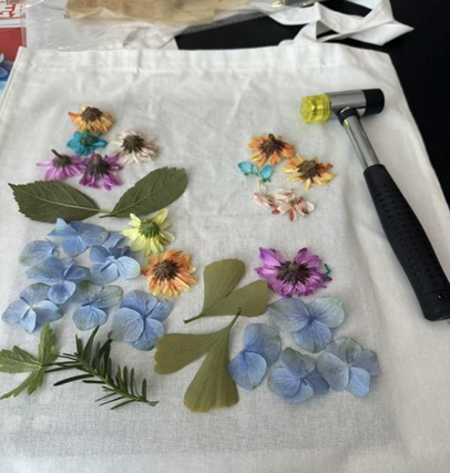 (帆布包拓染:用真花瓣/叶在帆布包上敲拓染色)