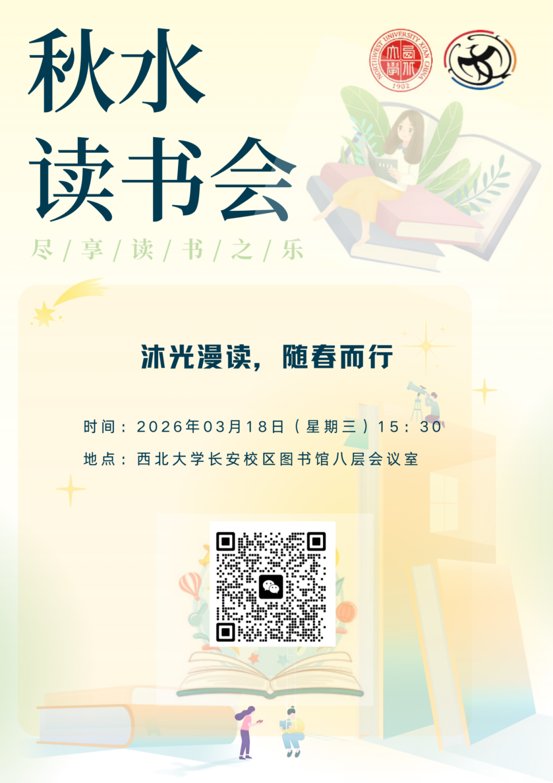 “秋水读书会”是由文学院创办的主题类读书分享活动,自2015年创办以来,已有来自不同院系的近千名同学参与其中,通过多院系合作、打破学科壁会的方式,为同学们提供一个拓展思维的读书交流平台,让同学们在交流程,碰撞出不一样的灵感火花。春天,大地从沉睡中苏醒,新绿爬满了枝头,每一寸光阴都在诉说着生长的秘密。在这个万物复苏的季节,不再让阅读止于书本文字的游历,本次活动将与西北大学公共管理学院合办,围绕“沐光漫读,随春而行”这一主题展开。走向户外、探寻自然中萌发生长的春和景明;走入内心,探寻生命中化冰温暖的融融春意,寻找又是一年春的鲜明希望。