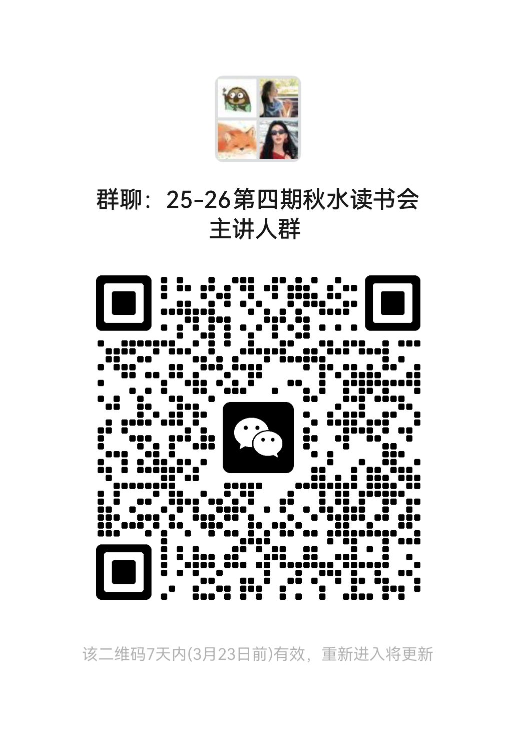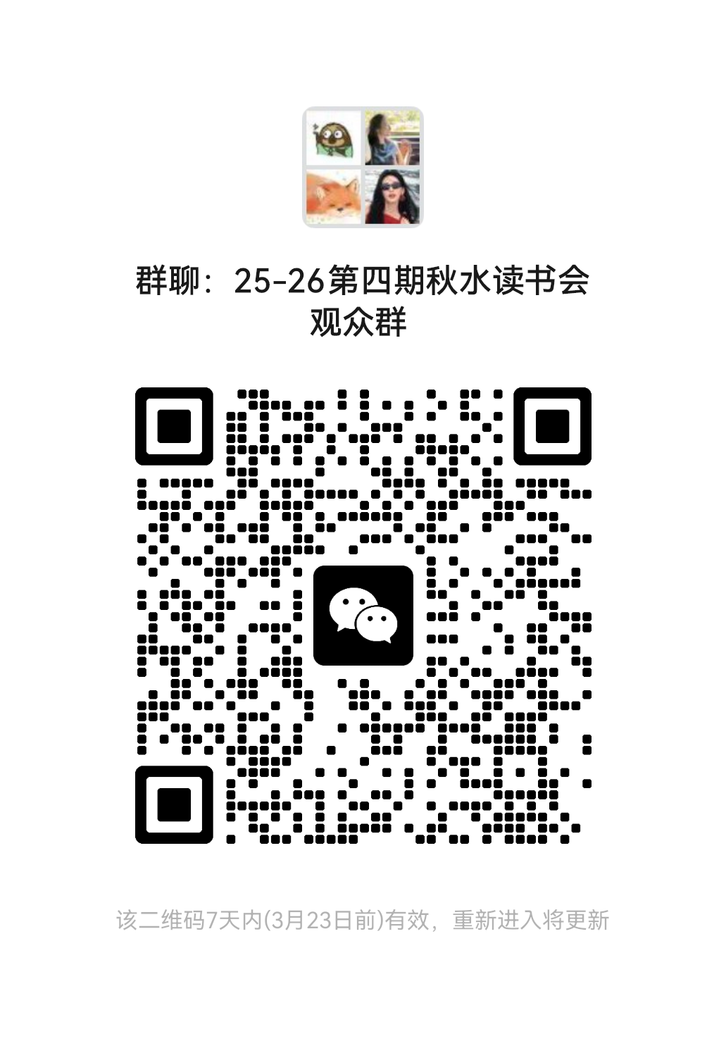 主讲人和观众均可扫描下方二维码加入读书会群聊(如遇相关问题,可咨询群众工作人员),主讲人请再扫描下方二维码提供报名信息。