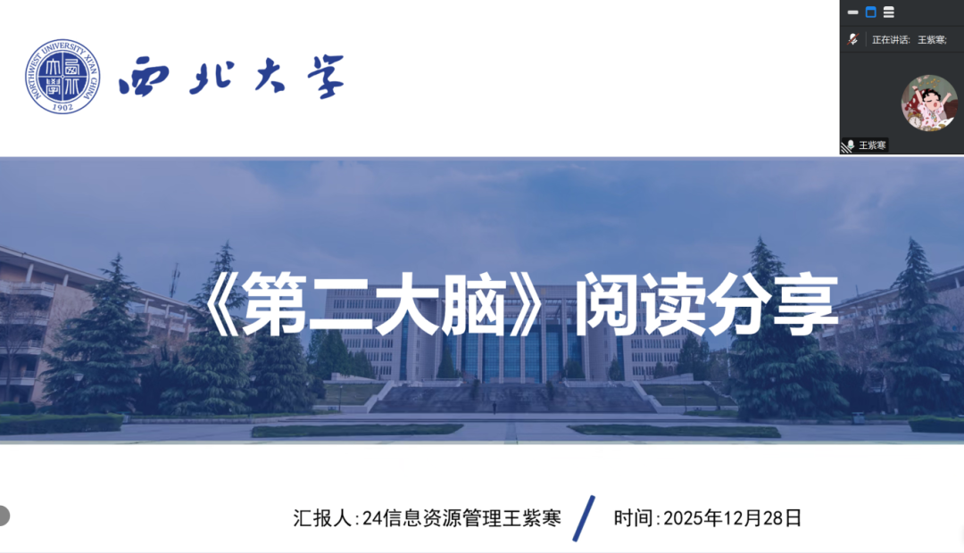2024级信息资源管理专业硕士研究生王紫寒分享的书籍是涂子沛所著《第二大脑》,该书聚焦数字时代信息过载痛点,给出了构建个人数字化知识管理系统的解决方案。分享围绕写作背景、核心内容、价值评价及个人感悟四大维度展开,聚焦“为何需要第二大脑”“何为第二大脑”“如何构建第二大脑”三大核心问题,层层递进阐述其逻辑:第二大脑作为介于生物大脑与互联网间的个性化数字记忆体,它既能弥补人类记忆局限、破解互联网信息发散弊端,又能通过“记录-存储-连接-创造”闭环实现知识体系化沉淀。分享还进一步阐释了第二大脑的三重价值——推动个体认知升级、革新组织知识管理、重塑社会知识传承,也客观剖析了技术依赖风险、隐私安全挑战以及构建维护门槛技术等挑战,在个人感悟部分,王紫寒同学指出记录本身是思维的显化,第二大脑不仅是个人在数字时代构筑核心竞争力的工具,更承载着思维延续与数字遗产传承的意义,分享尾声,她提出深刻反思:如何避免陷入工具依赖,保持人的主体性与自主思考能力? 闫晓萌博士对王紫寒同学的分享给予了高度评价,认为其兼具理论深度与实践价值。她的分享内容充实、表达流畅、思路清晰,从“第二大脑”的核心概念、运行逻辑及核心价值等方面进行了层层剖析。同时对于“人机交互”这一前言概念,认为机器并非取代人,而是更好地塑造人。总而言之,王紫寒同学所分享的书籍在当今数字时代具有较强的时代价值和前沿引领性。