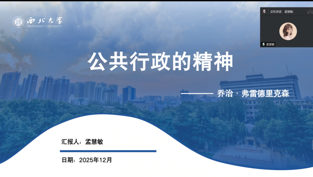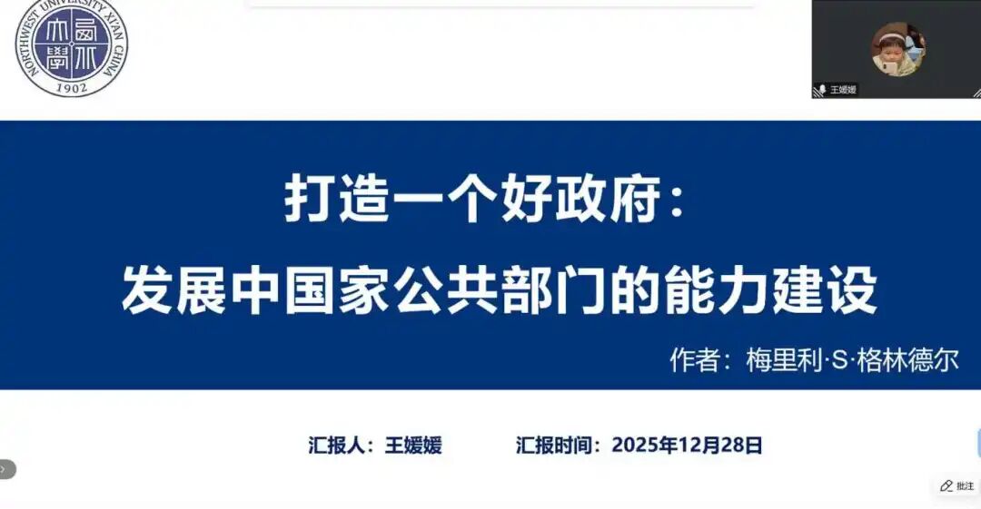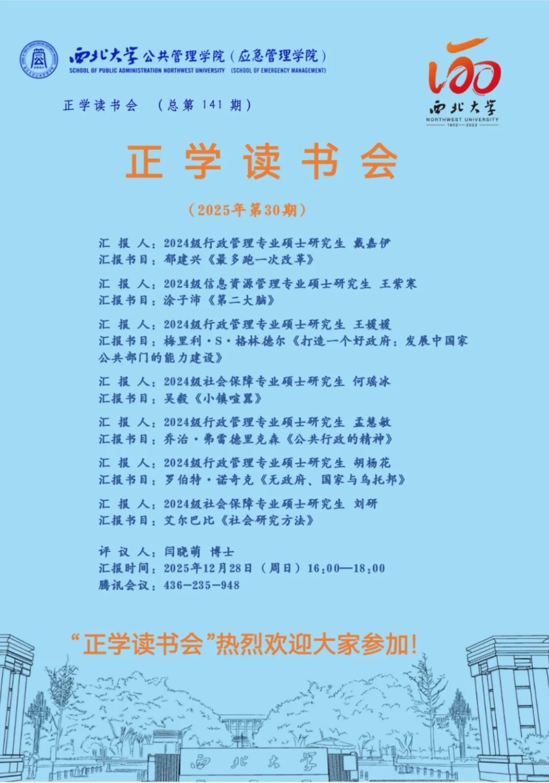 2025年12月28日,我院线上举办了2025年第30期正学读书会。西北大学公共管理学院2024级行政管理专业硕士研究生戴嘉伊、2024级信息资源管理专业硕士研究生王紫寒、2024级行政管理专业硕士研究生王媛媛、2024级社会保障专业硕士研究生何瑶冰、2024级行政管理专业硕士研究生孟慧敏、2024级行政管理专业硕士研究生胡杨花、2024级社会保障专业硕士研究生刘研分别作为主讲人进行读书汇报,公共管理学院2025级博士研究生闫晓萌担任评议人,部分研究生旁听了此次报告会。
