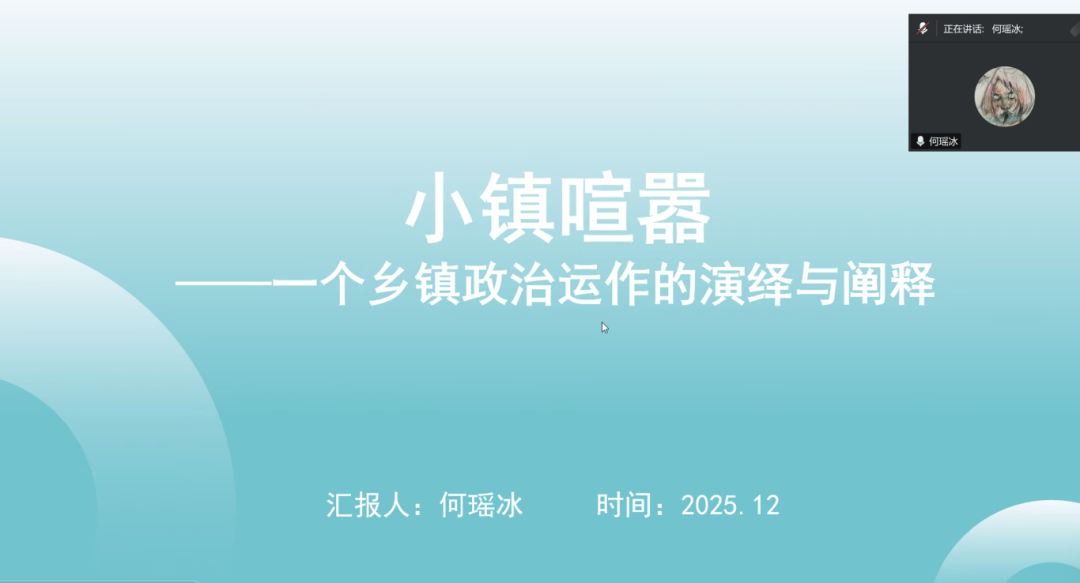 2024级社会保障专业硕士研究生何瑶冰分享的书籍,是吴毅教授的经典民族志著作《小镇喧嚣:一个乡镇政治运作的演绎与阐释》。这本近二十年印刷二十六次、学界公认 “在这里读懂中国” 的必读之作,以锋利的学术视角与生动的叙事笔触,剖开了21世纪初乡域政治的肌理。 书籍围绕 “田野深耕,还原真相”“乡域博弈,解码逻辑”“情法理交织,权宜运作”“古今对话,照见当下”“方法示范,学术启迪” 五大主题展开,分享人重点拆解了书中五大核心故事:迎检背后的政策变通、征税中的 “擂” 与 “媒” 智慧、征地开发的利益博弈、农业结构调整的体制性困境、官民纠纷的情法理权衡,生动呈现了 “正式权力的非正式运作” 这一核心逻辑。 何瑶冰同学认为基层治理并非非黑即白的简单叙事,而是多重利益、多种逻辑碰撞的 “喧嚣” 场域。对于社保专业而言,唯有读懂基层政治的运作肌理,才能让社会保障政策真正落地生根、温暖人心。这场兼具学术深度与现实关照的分享,为大家打开了理解中国基层社会的新窗口,也为未来政策实践注入了宝贵的实践智慧。 闫晓萌博士对此次汇报给予高度评价:《小镇喧嚣》的价值不仅在于其扎实的田野调查与精妙的叙事,更在于它为我们提供了理解中国社会复杂性的钥匙。书中揭示的基层博弈逻辑,对当下乡村振兴、基层治理现代化等议题仍具强大解释力,无论是学术研究还是政策实践,都能从中汲取 “尊重现实、正视复杂” 的智慧。
