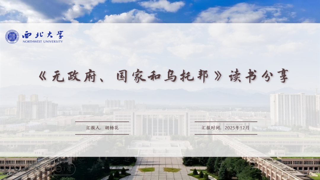 2024级行政管理专业硕士研究生胡杨花分享了罗伯特·诺奇克的《无政府、国家和乌托邦》一书。她从作者及写作背景、诺奇克国家理论的建构路径、资格理论与分配正义、元乌托邦国家框架、思考与启示五个方面展开分享。首先她简要介绍罗伯特·诺奇克作为哈佛大学哲学教授、古典自由主义代表人物,受战后福利国家弊病显现及保守主义思潮兴起,于1974年出版该书,直接回应约翰·罗尔斯《正义论》,引发自由与平等之争,次年这本书获美国国家图书奖,被誉为二战后最具影响力的百部著作之一。其次,她根据书中内容的阅读,对主要内容进行归纳总结,系统梳理诺奇克的“权利、正义、最小国家”的理论体系,以及这一理论体系在书中的逻辑链条。最后她指出《无政府、国家和乌托邦》中对个人权利与国家权利边界的思考、最低限度的国家与现实的不适应性、“看不见的手”论证的有限性。 闫晓萌博士对胡杨花同学的汇报分享内容进行点评,首先她认为,胡杨花同学对于分享内容的归纳、核心概念的解读、思想的总结与思考、批判内容较为丰富,讲解清晰。其次,她指出在目前应用性研究的浪潮下,也不可忽略对经典文献的研读。最后,她指出这本书能深化对政治制度伦理基础的理解,推动学界重新审视权利哲学的现代意义。