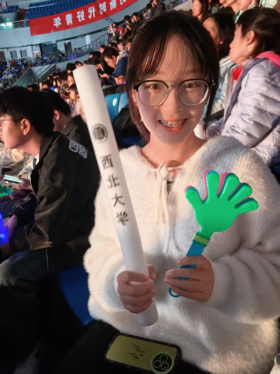 当灯光暗下,我攥着印着“西北大学”的泡沫棒,指尖的温度和周围的喧闹裹在一起,忽然真切地接住了“新生”这个词。开场音乐炸开的瞬间,绿色拍手器的声响撞在耳边——原来“新”是这样具体的触感:是陌生座椅上挨着的肩膀,是邻座递来的荧光棒,是所有人跟着旋律晃动手臂时,像一片被风掀起的星子海。我举着泡沫棒,看台上台下的热情高涨,忽然想起行李箱轱辘碾过校园石板路的那天,当时只觉忐忑,此刻却被这团热闹揉得软和。最惊喜的是充满童年记忆的合唱。明明是刚记住名字的同学,却能顺着同一节拍开口,歌声裹着体育馆的回声落下来时,我攥着拍手器的手心出了汗。原来大学的“大”,不是楼宇的宽,是千万个“我”聚在这里,能把孤单酿成共振。这场晚会不是终点,是我往新故事里迈的第一步——往后的日子,应该像今晚的荧光一样,既亮着自己的光,也融进人群的暖;所有陌生的慌张,都成为热乎的日常。