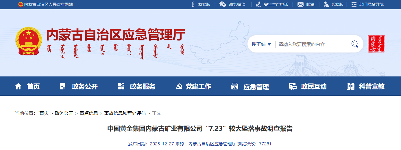 12月27日上午,内蒙古自治区应急管理厅发布中国黄金集团内蒙古矿业有限公司“7.23”较大坠落事故调查报告。该事故发生于2025年7月23日,造成6人遇难、1人受伤,经调查认定为一起较大生产安全责任事故。报告详细揭示了事故经过、原因及责任追究等情况。