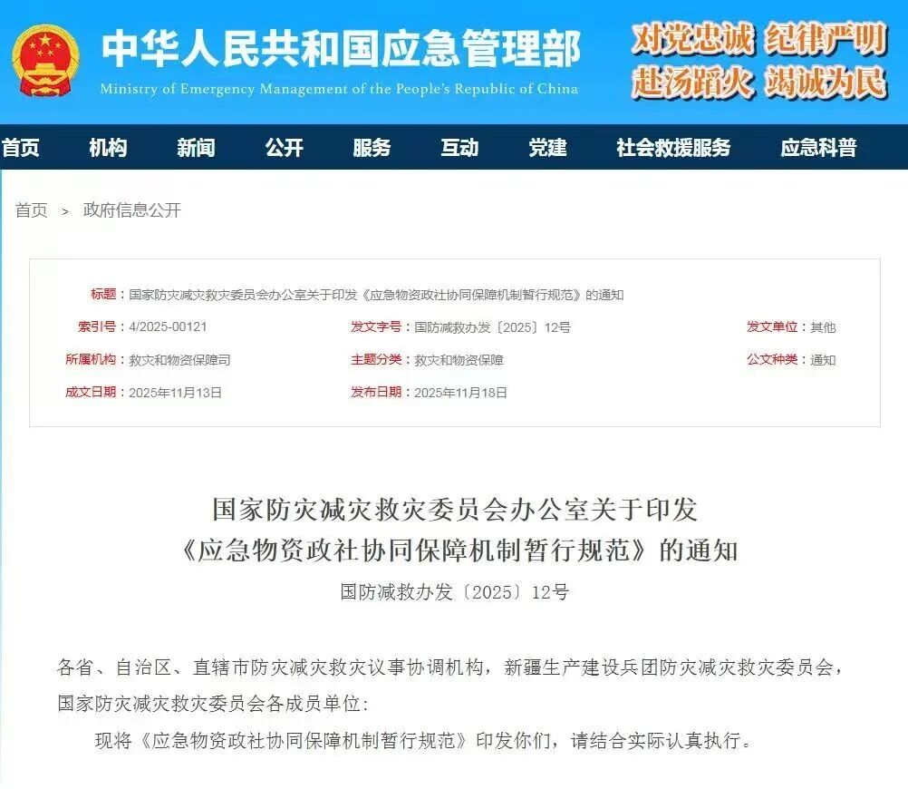 第二条 应急物资政社协同保障机制(以下简称政社协同机制)是国家防灾减灾救灾委员会办公室(以下简称国家防减救灾办)、应急管理部牵头建立,基金会、行业协会、社会服务机构、志愿服务组织等社会组织作为成员参与,根据自然灾害等重特大突发事件物资保障需要,在政府支持调拨应急抢险救灾物资基础上,规范开展社会援助捐赠物资的协同保障机制。根据保障需要,国家防减救灾办、应急管理部协调工业和信息化部、交通运输部、商务部、国家粮食和物资储备局、中国红十字会总会以及涉灾的省级有关部门等给予指导支持。
