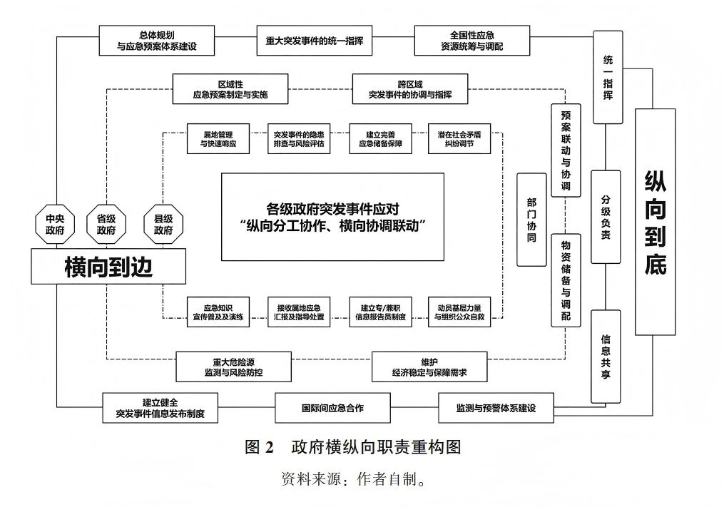 纵向职责重构需以国家治理现代化为指向,强化县级治理主体责任、激活省级应急统筹功能、凸显中央战略主导地位等系统化制度供给,推动纵向应急管理体系从“层级管控”向“功能整合”转型,形成“县级首控—省级兜底—中央统筹”的中国特色纵向应急治理格局。