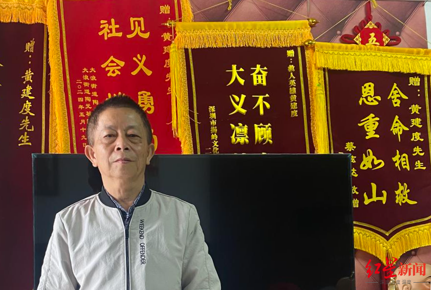 (黄建度在收到的锦旗前)