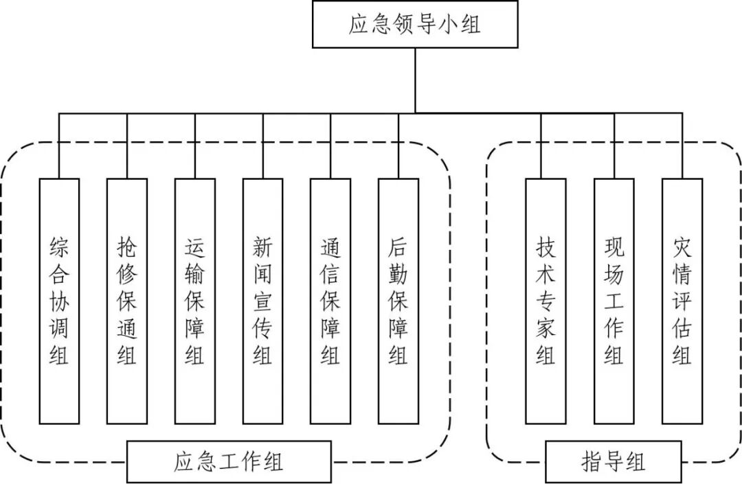 根据应急工作需要,领导小组可下设综合协调组、抢修保通组、运输保障组、新闻宣传组、通信保障组、后勤保障组等应急工作组,具体承担应急响应的组织、协调、指挥等工作。